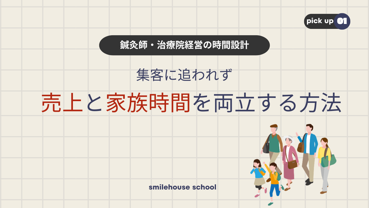 これは多くの鍼灸師・治療院経営者が抱えている悩みです。特に子育て中の鍼灸師さんや治療家さんは、売上も守りたい。時間も守りたい。