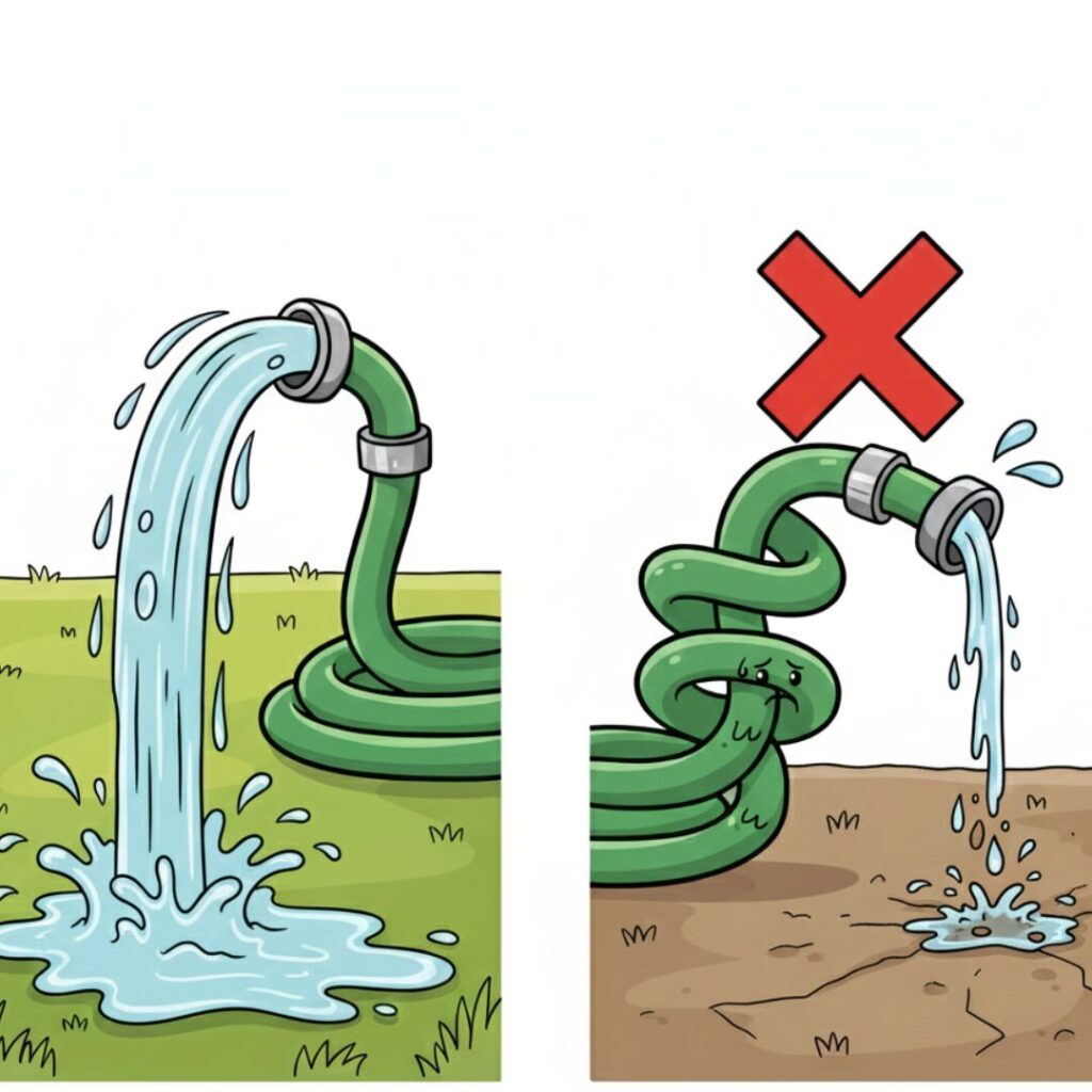 ホースのどこかが詰まっていれば、水はスムーズに流れません。